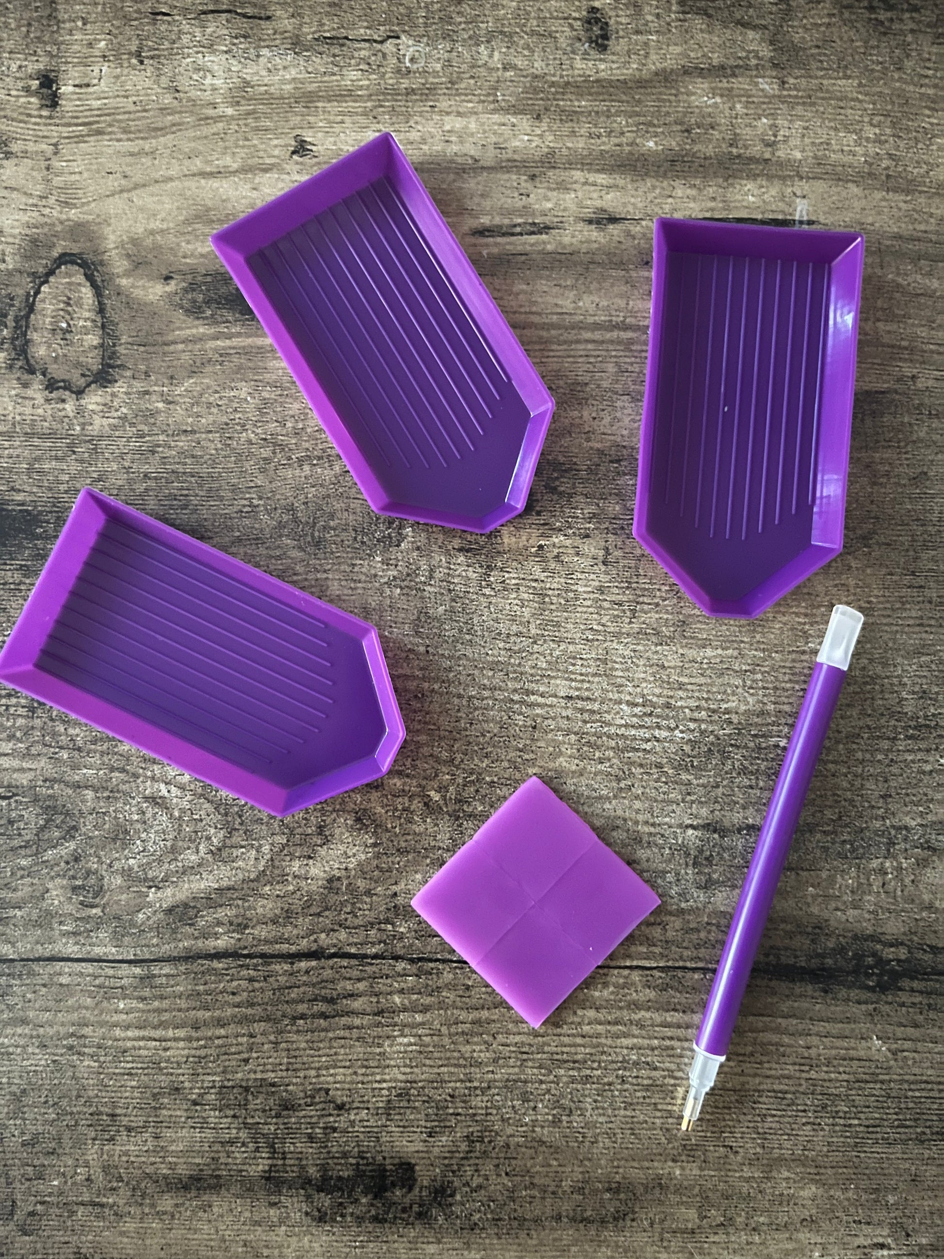 These are add on diamond painting tool kits. Just extra pieces for you. There are 3 trays, 4 glue sticky squares and 1 dotting tool.